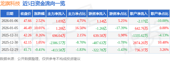 证券之星音讯,到2026年1月6日收盘,龙旗科技(603341)报收于47.66元,上涨2.52%,换手率17.19%,成交量45.76万手,成交额21.73亿元。